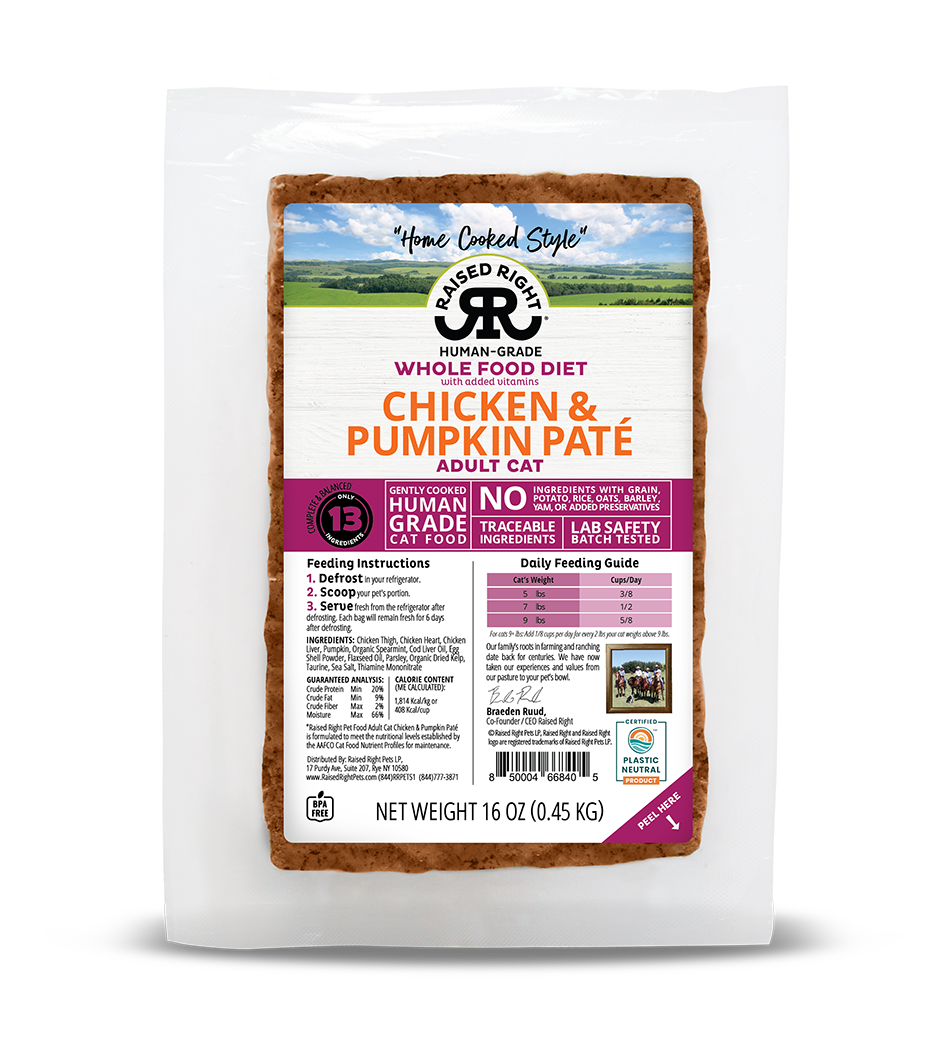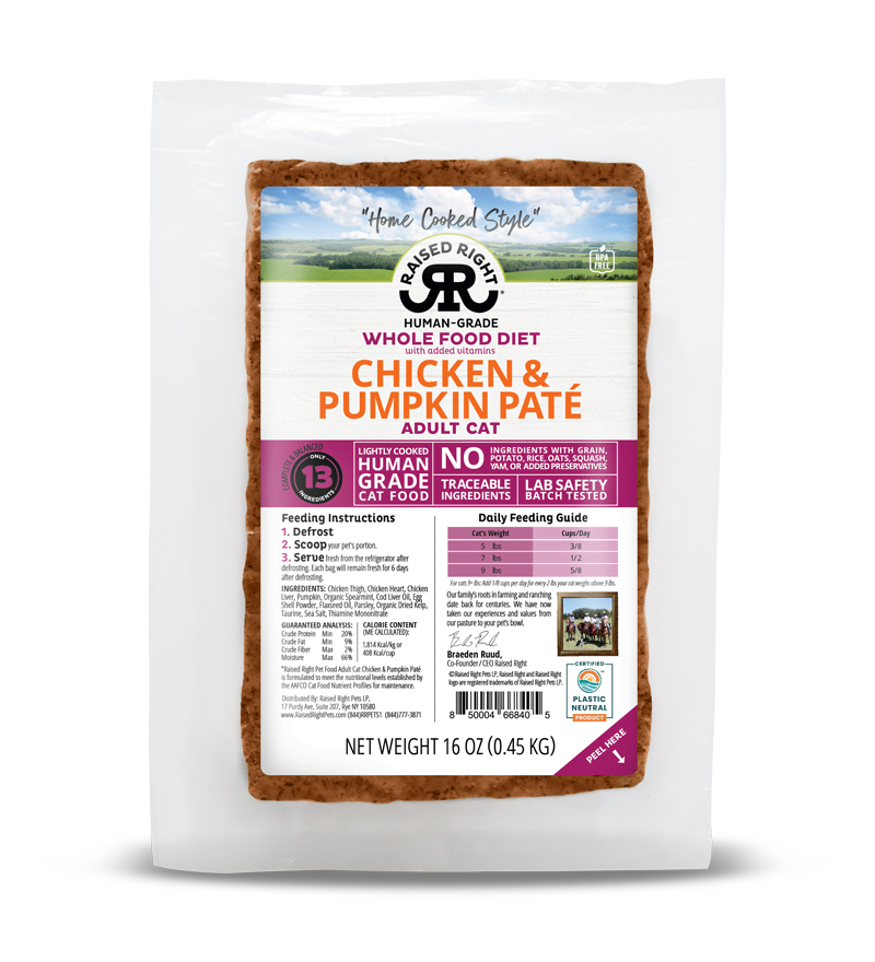Our Chicken & Pumpkin Paté for Adult Cats is formulated to meet the nutritional levels established by the AAFCO Cat Food Nutrient Profiles for maintenance. Calorie content (ME Calculated): 51 kcal / oz (1,814 kcal / kg)