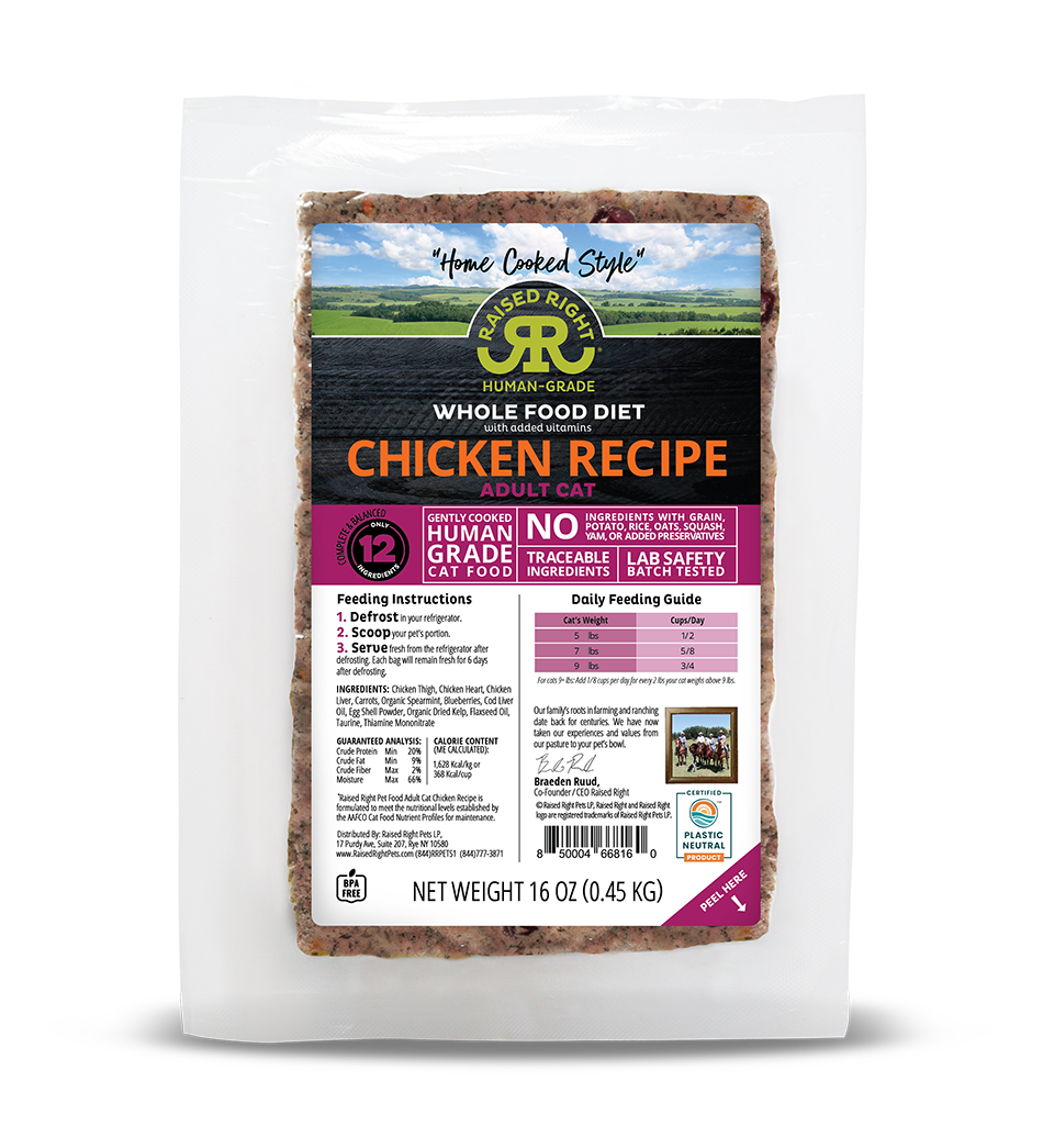 Our Chicken Adult Cat Recipe is formulated to meet the nutritional levels established by the AAFCO Cat Food Nutrient Profiles for maintenance. Calorie content (ME Calculated): 46 kcal / oz (1,628 kcal / kg)