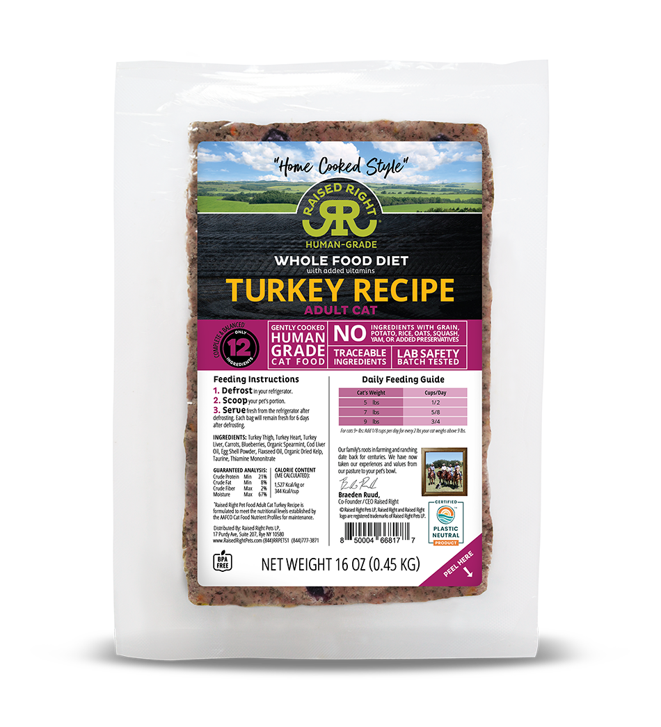 Our Turkey Adult Cat Recipe is formulated to meet the nutritional levels established by the AAFCO Cat Food Nutrient Profiles for maintenance. Calorie content (ME Calculated): 43 kcal / oz (1,527 kcal / kg)
