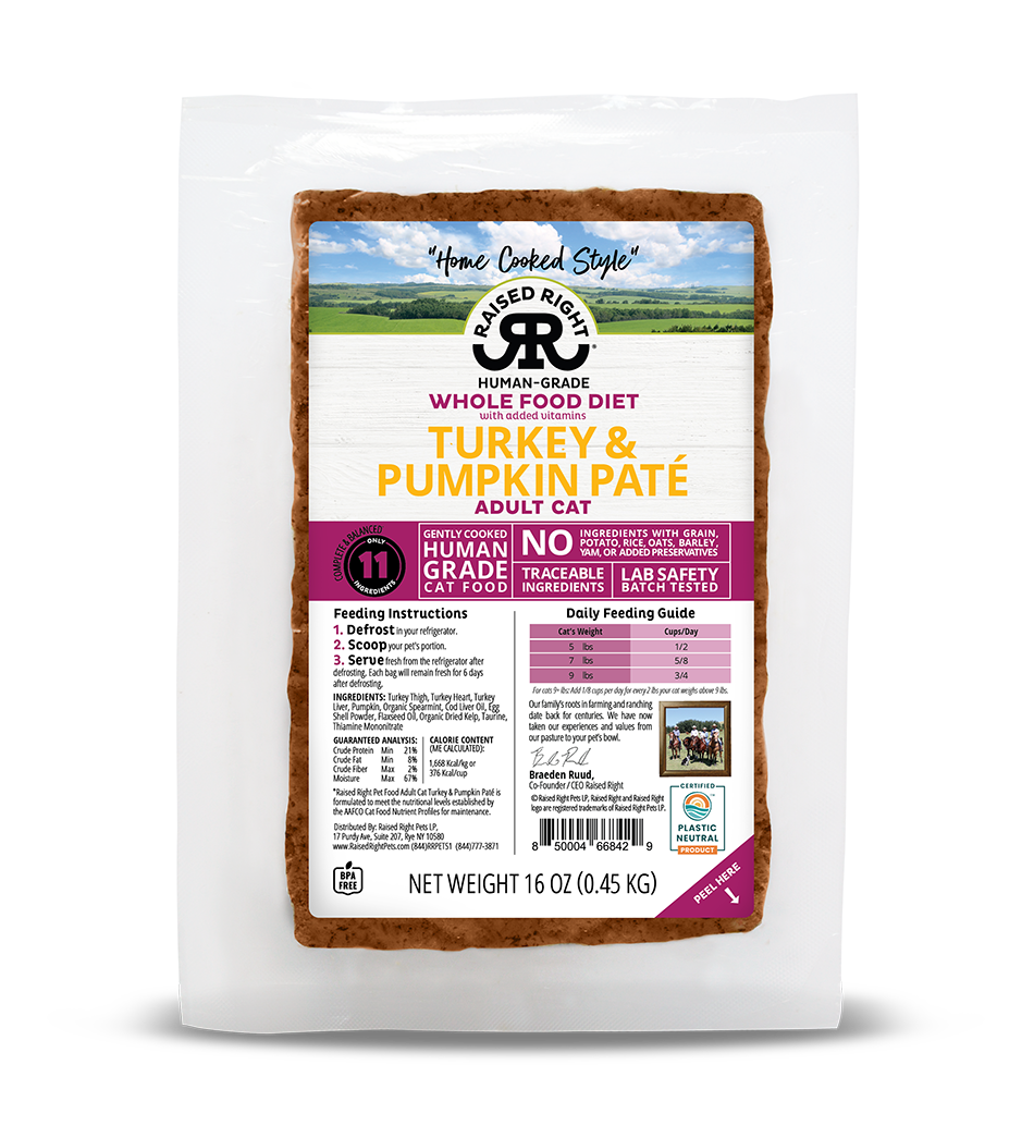 Our Turkey & Pumpkin Paté for Adult Cats is formulated to meet the nutritional levels established by the AAFCO Cat Food Nutrient Profiles for maintenance. Calorie content (ME Calculated): 47 kcal / oz (1,668 kcal / kg)
