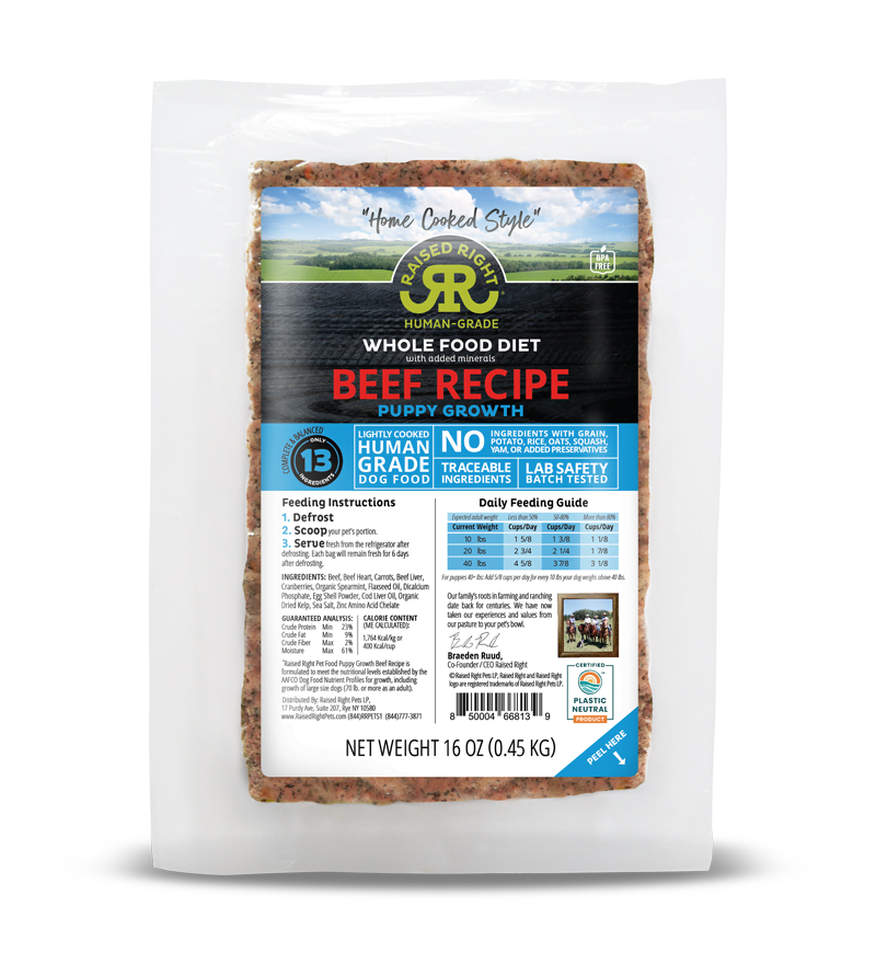Our Beef Puppy Growth Recipe is formulated to meet the nutritional levels established by the AAFCO Dog Food Nutrient Profiles for growth, including growth of large size dogs (70 lb. or more as an adult). Calorie content (ME Calculated): 400 kcals / cup (1,764 kcals / kg)