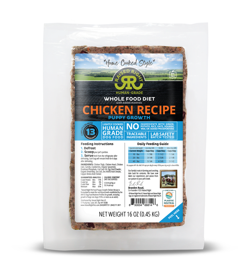Our Chicken Puppy Growth Recipe is formulated to meet the nutritional levels established by the AAFCO Dog Food Nutrient Profiles for growth, including growth of large size dogs (70 lb. or more as an adult). Calorie content (ME Calculated): 352 kcals / cup (1,554 kcals / kg)